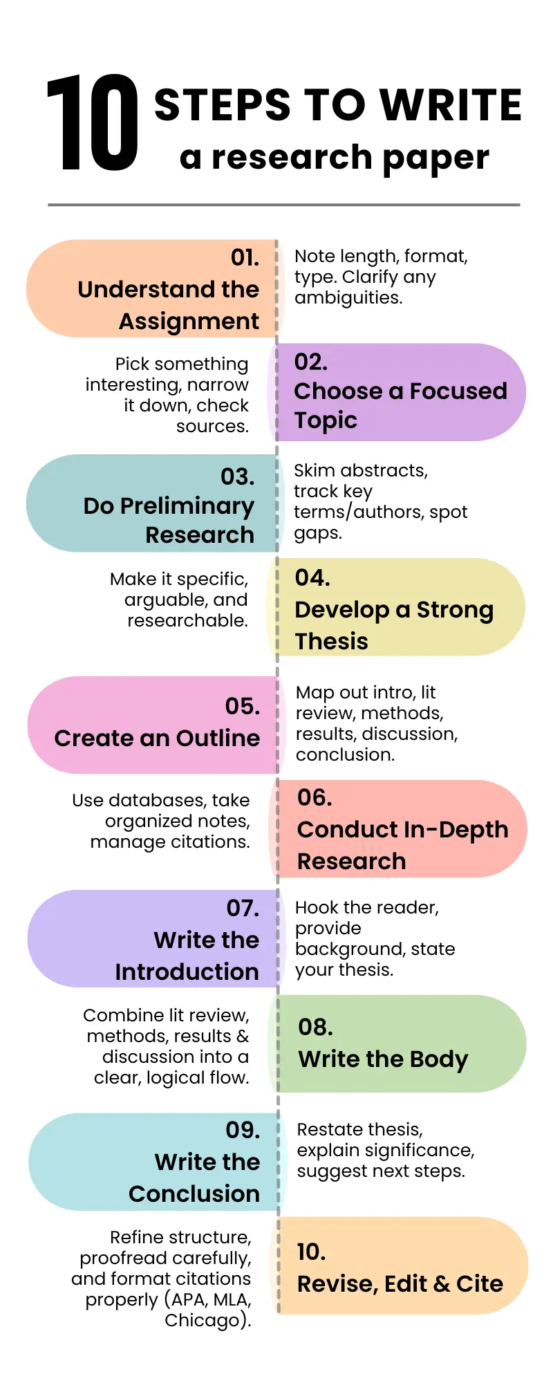 Writing a research paper can feel overwhelming at first, but breaking it into clear steps makes the process much more manageable. Instead of trying to tackle everything at once, think of it as a sequence: first you understand what’s required, then you choose and refine your topic, gather evidence, and finally shape it into a structured argument. Each step builds on the last, helping you stay focused and confident as you move from a blank page to a finished paper.